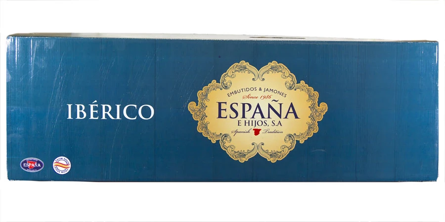 Set z přední kýty o hmotnosti cca 5 kg a délce zrání 15 měsíců z černého iberského prasete, stojanu Banqueta a základního nože puño negro. Složení jamónu: vepřové maso, sůl.