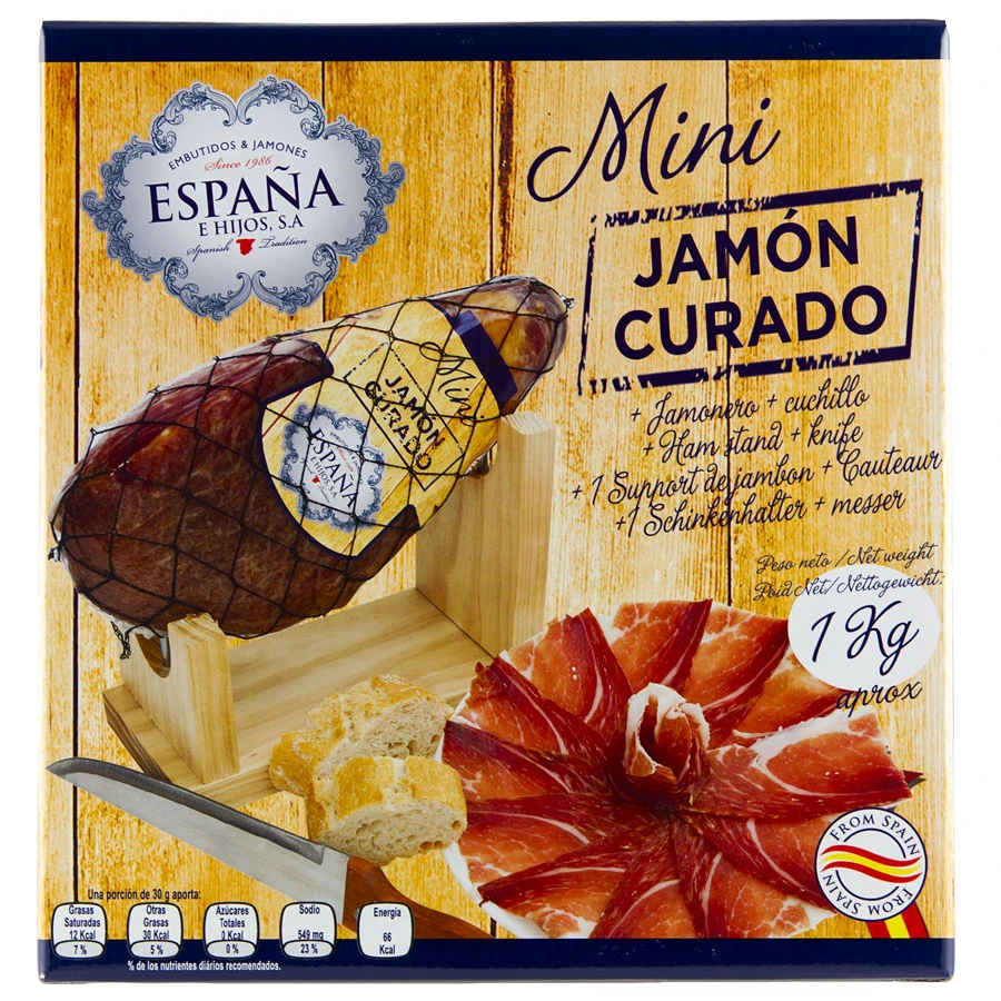 Set obsahuje: Mini jamon serrano o hmotnosti 1kg čistého masa bez kosti, stojánek na upevnění jamonu a nůž na krájení jamonu.